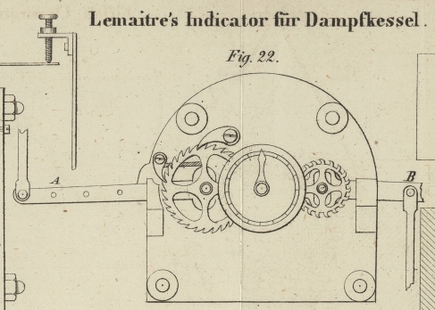 | Titel: | Lemaitre's Indicator für Dampfkessel, durch welchen das Speisen derselben überwacht wird, und welcher durch Glocken Zeichen gibt, wenn Unregelmäßigkeiten eintreten. |