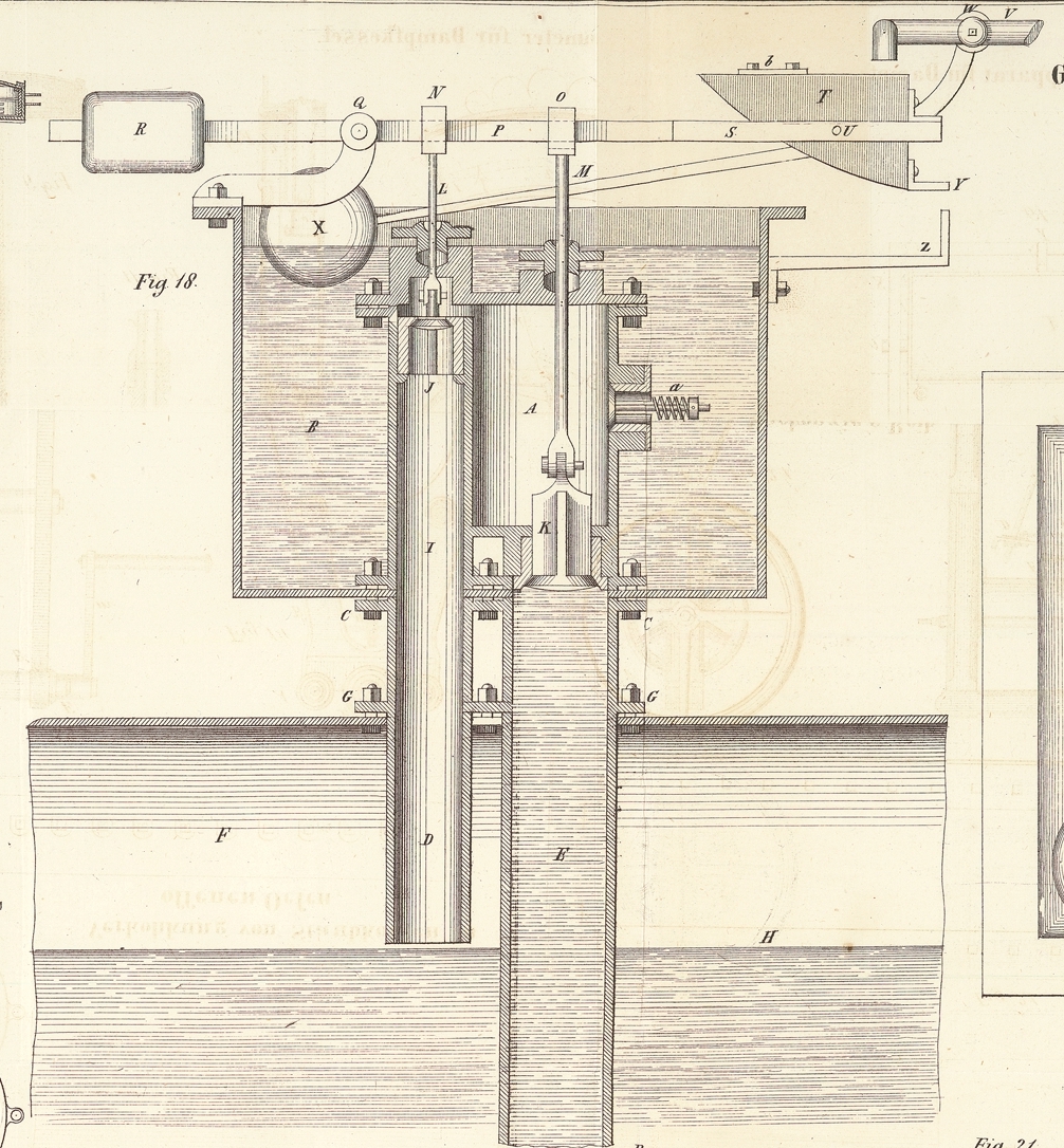 Cylinder A mit Wasser aus dem Behälter B füllt. Die nachfolgende Bewegung des Hebels öffnet die
