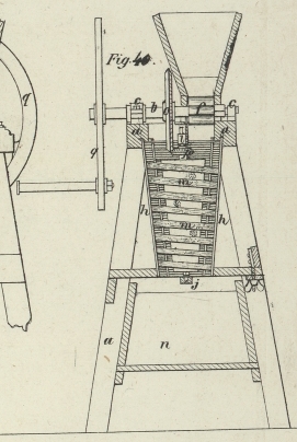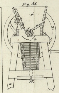 festgekeilt ist und sich am Boden des Rumpfs dreht. Der geneigten Ebene e gegenüber ist eine adjustirbare Bürste g angebracht, welche sich gegen die Walze lehnt und