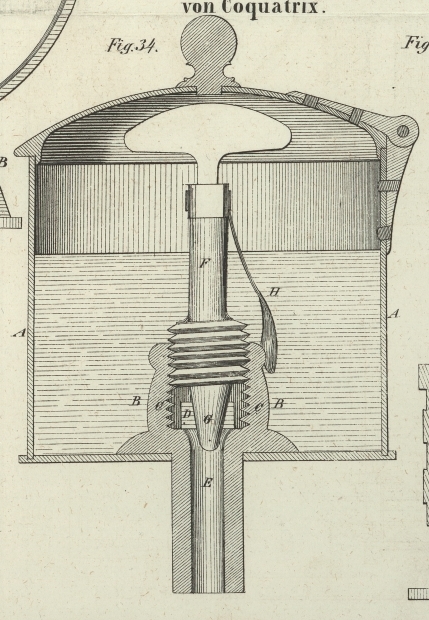 Das Oel gelangt durch zwei Oeffnungen D in die Röhre E, deren oberes Ende durch eine Schraube F verschlossen ist, die man mit der Hand drehen kann.