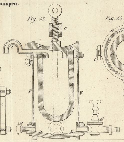 D, D ist ein gußeiserner Fuß, in welchem die Zuflußröhre