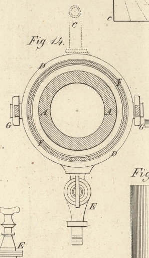und im Deckel ist der aus Weißblech bestehende cylindrische Mantel F, F eingelassen, und der Bügel mit Schraube G, welcher zu beiden Seiten über Bolzen am Fuß greift,