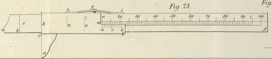 Millimeters abgelesen werden können. Da in Fig. 28 die Hülse k, l einige Striche der Stangentheilung verdeckt, so hat