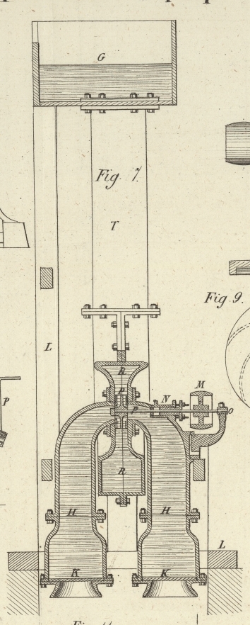 herbeigesaugte Wasser die Röhre T hinaufgetrieben und in