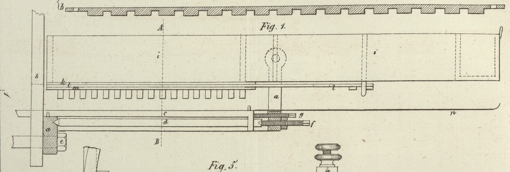 sich eine andere Stellschraube g, die dem Schieber d mit der Ladeform das Ziel seines Laufes bestimmt.
