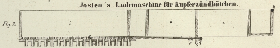 Lademaschine für Kupferzündhütchen; von J. H. Josten, Mechaniker in Ratingen bei Düsseldorf.Wir verweisen auf dessen Maschine zum Einpressen der Metalldecke in