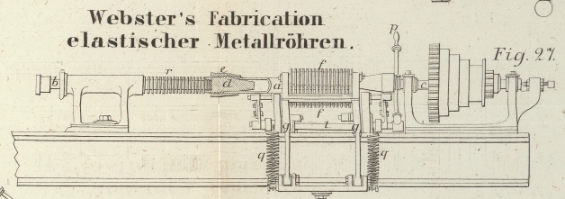 | Titel: | Fabrication elastischer Metallröhren, welche sich James Webster, Ingenieur zu Birmingham, am 5. April 1856 patentiren ließ. |