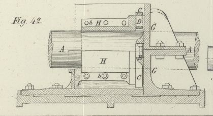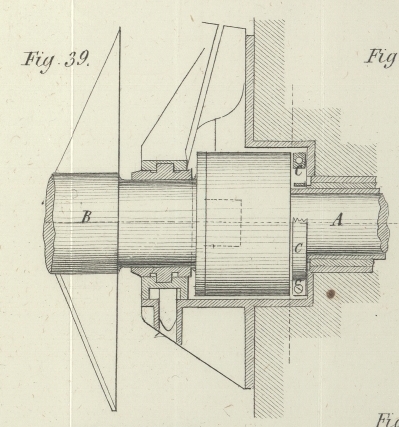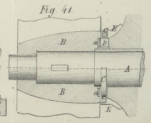 Holze des den Stoß aufnehmenden Theils des Apparates läuft. A ist die Treibwelle, welche in Fig. 39 und 40 an ihrem
