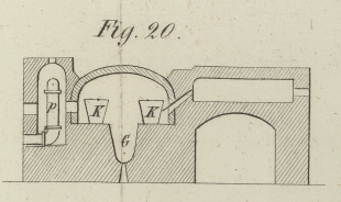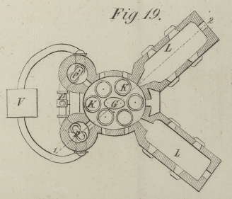 Durchschnitt nach der Linie 1–2 in Fig. 19. K sind die, wie gewöhnlich auf Bänken stehenden Häfen;
