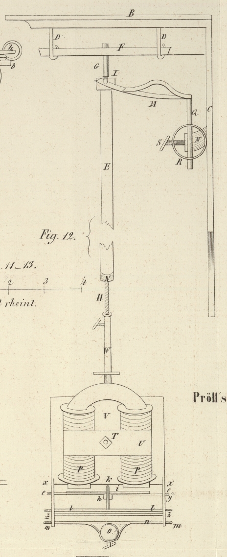 befindlichen Draht die Pendelstange entlang nach dem Elektromagneten P hinab, von wo er wieder in derselbigen Weise durch die