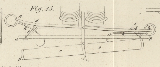 Anschlusse darbietet. Die beiden kleinen am Ende hakenförmig gebogenen Hebel k, k liegen oben auf den beiden Enden der Hebelarme g und h lose auf und sind