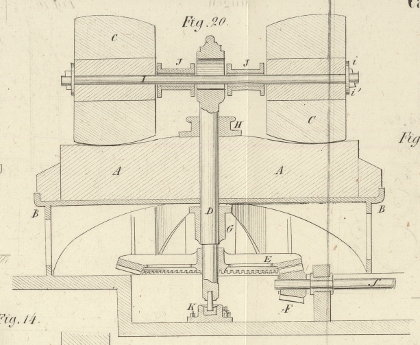 Auf der Platte A bewegen sich zwei Mahlsteine C, die ebenfalls aus Granit bestehen und sich frei um