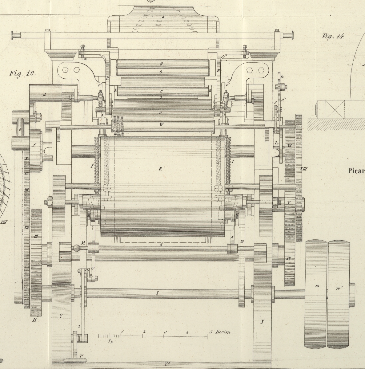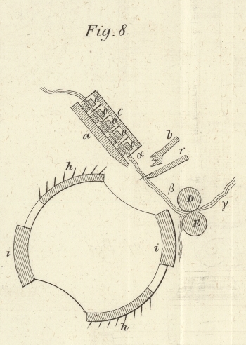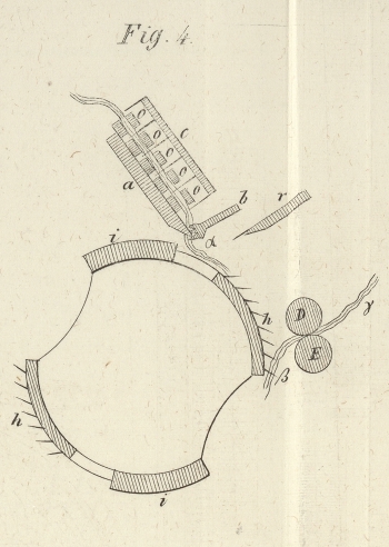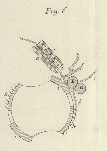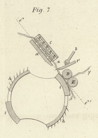 Die Walze F wird gegen das mit Leder besetzte Segment N dieser Trommel mittelst der federnden Stangen I und der Hebel p