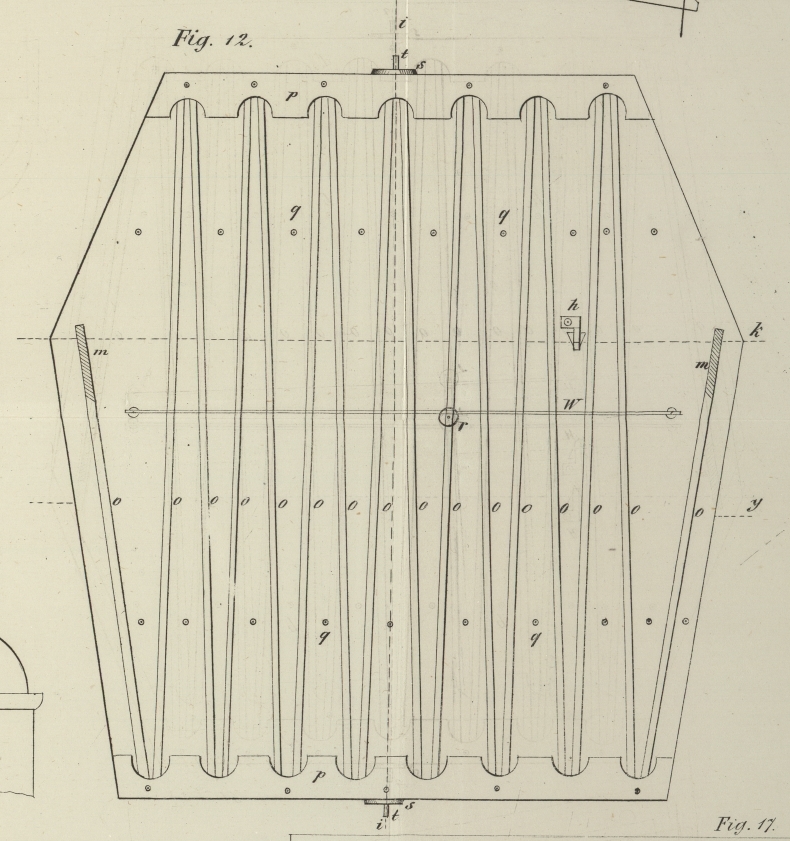 überstehenden, mit halbkreisförmigen Ausschnitten versehenen Schienen p. Alle drei Theile sind mittelst der Schrauben q mit einander verbunden. r