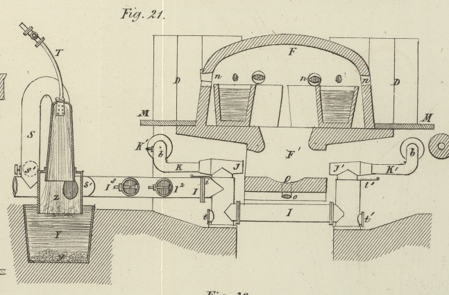 Reinigern zum Ofen; mittelst seiner Verlängerung I¹ unter den Ofen hindurch speist es die beiden Formen J und J¹. Die