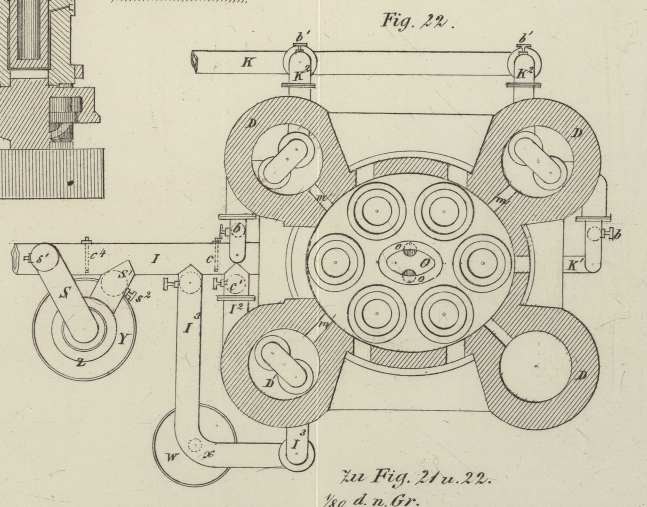 reguliren. Außerdem enthalten, wie gesagt, die zu den Formen führenden Röhren K¹ auch noch die Klappen b.