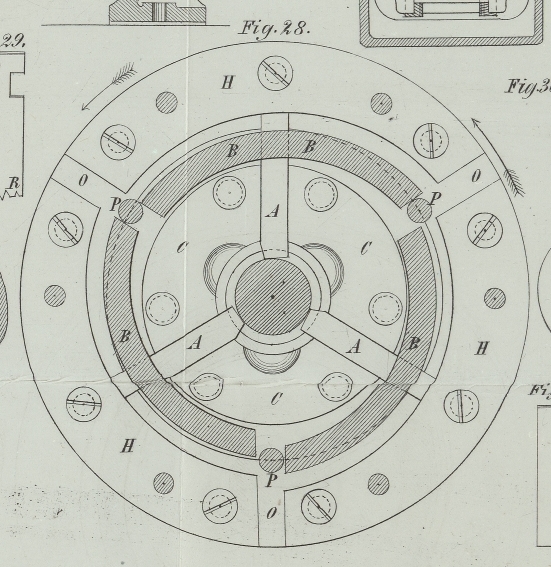 radial einwärts geschoben, sobald die Drehung aller Theile in dem Sinne erfolgt,