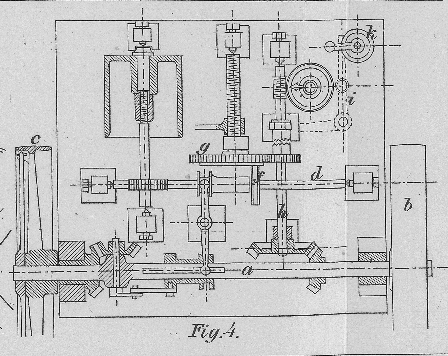 greift in ein zweites ein, welches auf einer kleinen, lose durch die Welle a gehenden Achse sitzt. Wo diese Achse aus der Welle