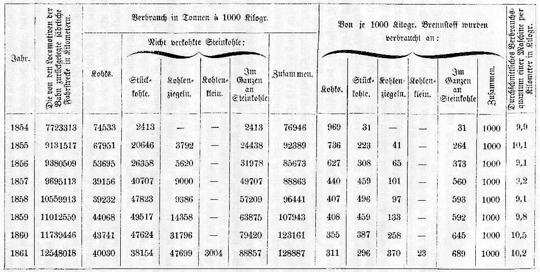 welche von den Locomotiven der Nordbahn von 1854 bis 1861 verbraucht wurden.