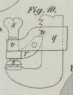 Mittelstange und q der bewegliche Arm; r ist ein Zwischenhebel, welcher die Stellschraube s mit dem drehbaren Kopfe t