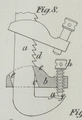 Mittelstück; b ist ein daran beweglicher Arm und c, c ein schiefer Einschnitt in demselben; d, d sind die Zähne am Mittelstück und e ist der Winkel am Arm, welcher ihn am Mittelstück