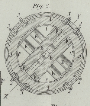 F Stahlringe zur Befestigung der offenen Röhrenenden E in die zu diesem Zwecke in der Cylinderwandung C angebrachten Oeffnungen.