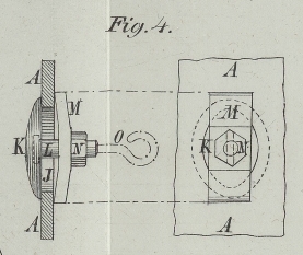 Zwecke ein Loch mit innerem Gewinde erhält, einen kleinen Haken O einzuschrauben, der in Fig. 4 punktirt ist und