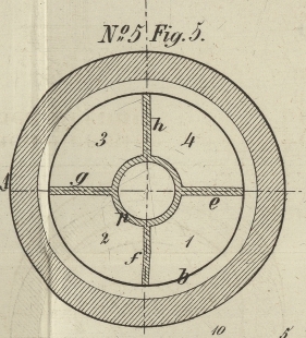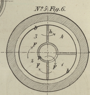(s. Fig. 1, 2, 3 und 4) bis zur Deckplatte J, K; sodann durch die Oeffnungen bei w, w (s. Fig. 1 oben bei F, F) hinunter in die Abtheilung 2 (s. Fig. 2 u. 3); hierauf unter der