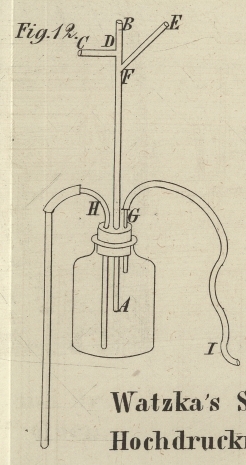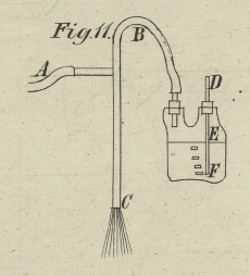 Wenn der Apparat als Gebläse dienen soll, so wird die Oeffnung C mit einem Wasserhahn verbunden, und dann das Gummirohr G, I einen Augenblick mit dem Finger geschlossen.