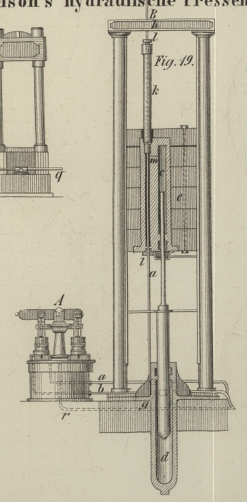 zu wirken. Dieser Stempel ist eine Fortsetzung des größeren in dem Hauptcylinder d, welcher mit der Grundplatte g in einem Stück gegossen seyn kann. Man sieht, daß die Cylinder c und d des Accumulators