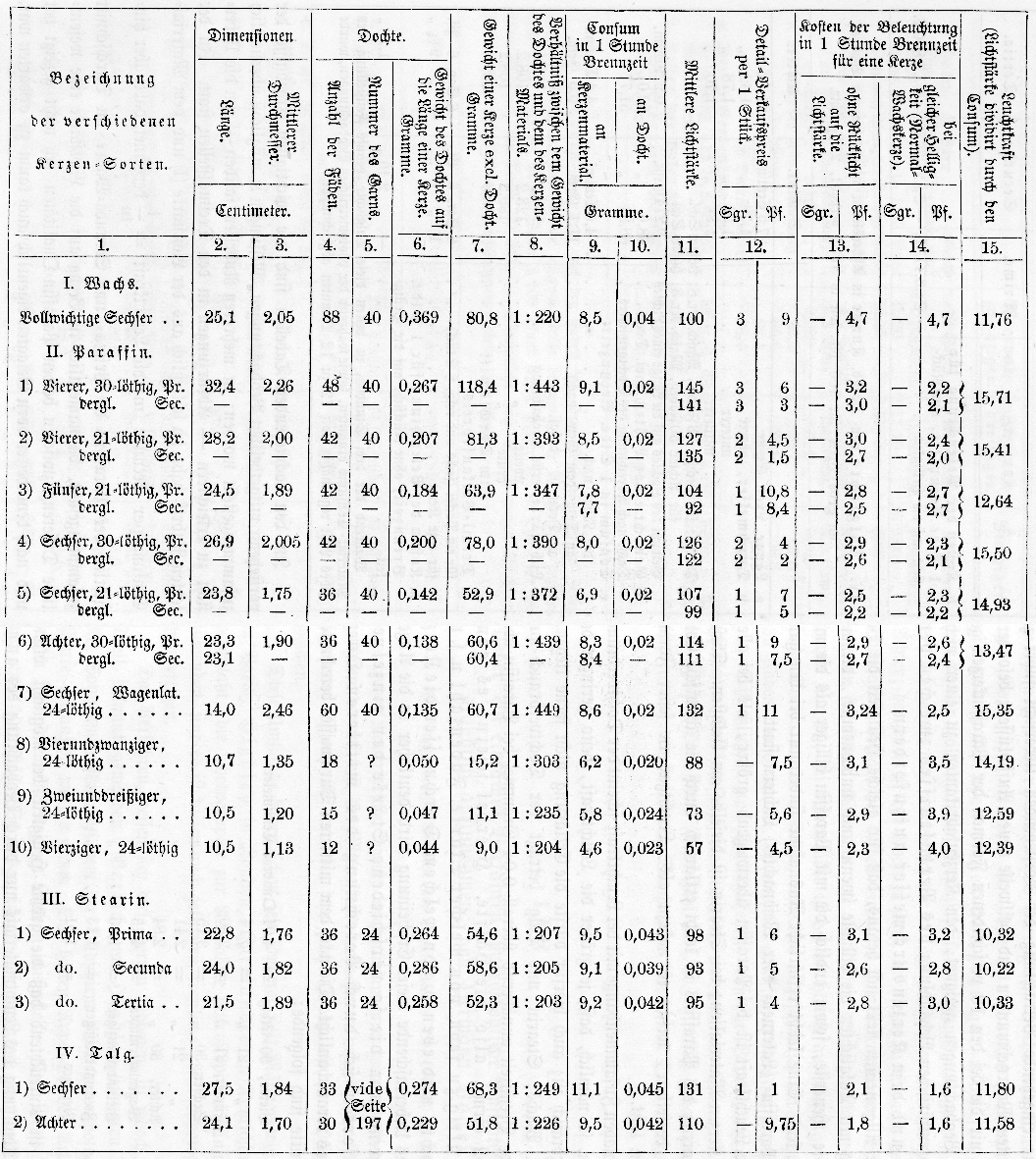 Bei Wachs, Stearin und Talg beträgt der Dochtverbrauch pro 1 Stunde Brennzeit annähernd überall 0,04 Gramme, bei Paraffin aber