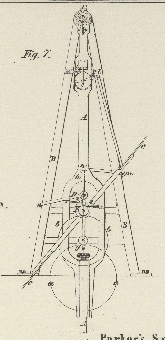Nun trägt aber die Achse des Windfanges eine excentrische Scheibe k, welche die Rolle p sanft
