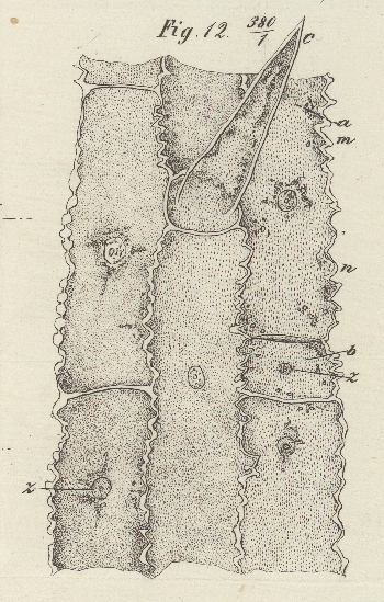 Oberhautfragment der oberen Blattfläche des Maiskolbenblattes. – c Basis des kegelförmigen Haares. – t Spaltenförmige Poren in der oberen Zellwand.