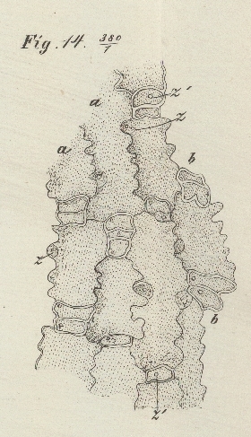 gelegen. – a lange Zellen, b verkieselte Zwergzellen. – 2,2 Kerne der Zellen a: z', z' Kerne der Zellen b.