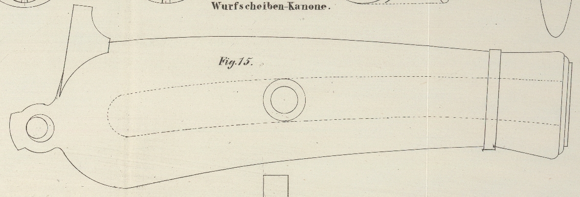 Versuche mit einem kleinen Wurfscheibengeschütze, dessen Pulverkammer unter der Seelenachse seines Rohres lag, wurden bereits