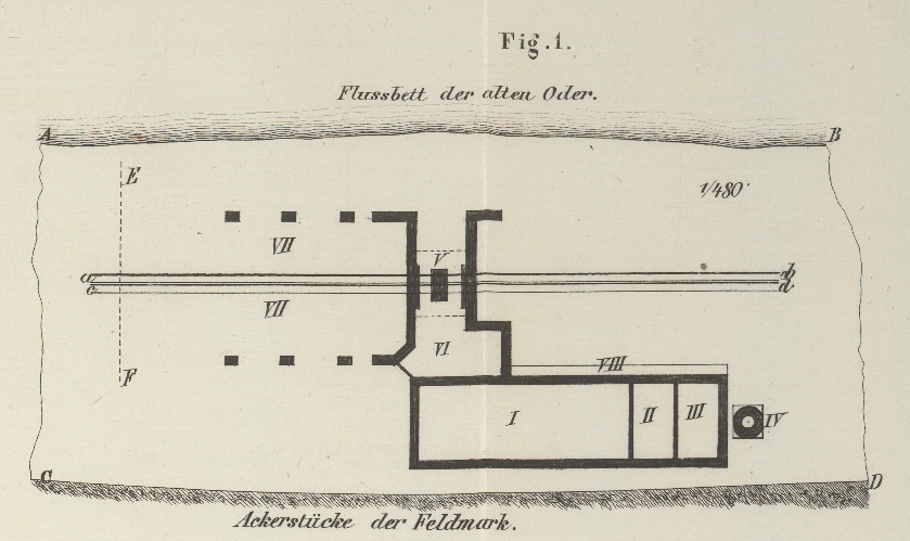 Dieselbe ergibt sich aus Fig. 1. Darin ist AB das rechtseitige Ufer der alten Oder, ABCD ein Theil des Grundstücks, welches 260 Ruthen
