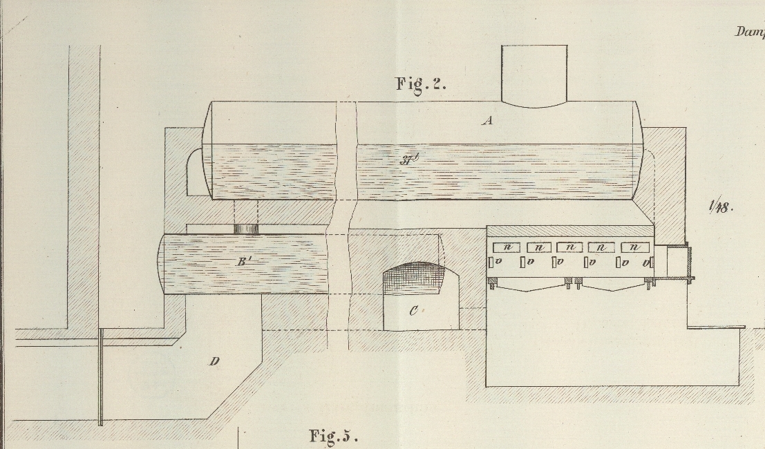 die Feuerluft nach dem Kessel schlägt. Außer diesen Oeffnungen sind noch in jedem