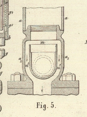 passirt das Absperrventil p, kommt in den Raum i, aus welchem er durch den ringförmigen Canal m und m² (Figur 5, ein