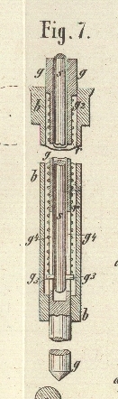 verticale Führung dieses Stiftes erfolgt in einem Schlitz g⁴ Spindel g. Das obere Ende von s ist mit einem Schraubengewinde versehen.