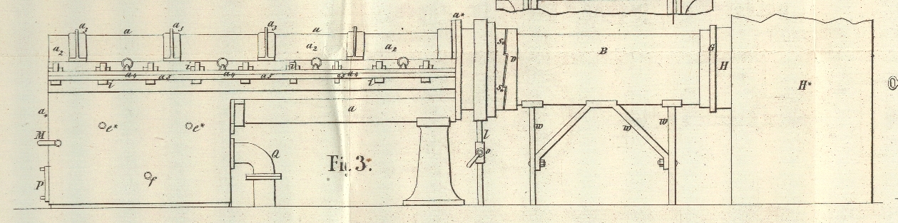 bedeutender Festigkeit bestehend, an welche die Stirnplatte a* von Gußeisen mittelst Flanschen und Winkeleisen so fest angeschlossen