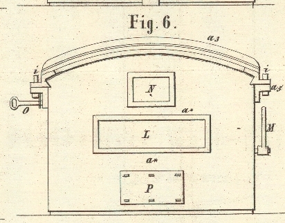 benutzt. Diese Thür N wird durch den Griff O (Figur 6) waagrecht hin und