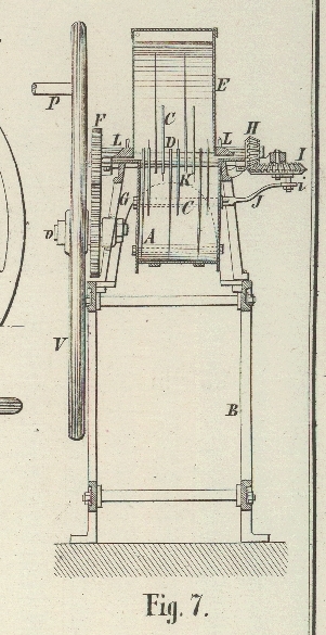 Die Messerachse D erhält vom Schwungrad V die drehende Bewegung durch das Räderpaar G, F, während die abwechselnd stattfindende Verschiebung