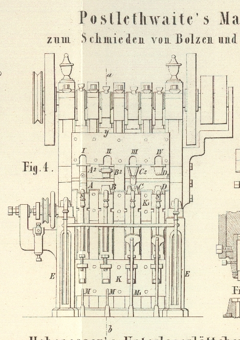 | Titel: | Maschine zum Schmieden von Bolzen und Muttern von G. R. Postlethwaite und Comp. in Birmingham. |