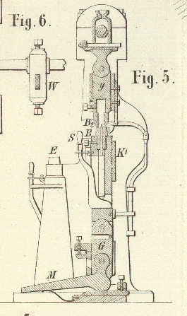Die vorgerichtete glühende Stange wird in II in das Untergesenk B gebracht und durch Niedertreten des Trittes M, dabei Heben des Gleitstückes G in den Wirkungsraum des Oberstempels B² geführt. Es ist selbstverständlich, daß dieser Arbeit die