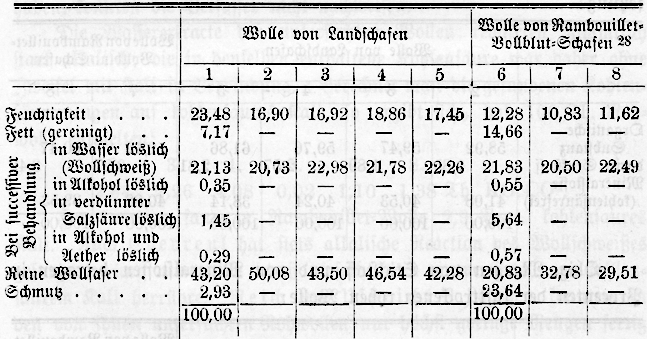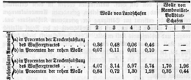 1,6 Proc. (ff. Kammwolle) und 3,4 Proc. (Haidschnuckenwolle); v. Bibra hat nur 0,87 Proc. Schwefel im Wollhaar