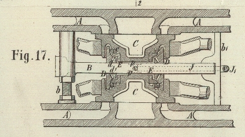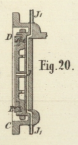 17 und 18 im Schnitt zu entnehmen ist, sind die Kappen D innen und außen von conischer Form und zwar lediglich zu dem Zweck, um