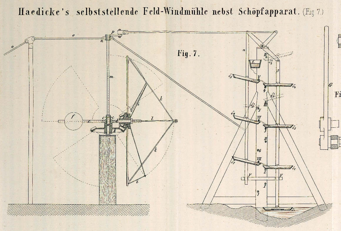 | Titel: | Selbststellende Feld-Windmühle nebst Schöpfapparat; von H. Haedicke, Marine-Ingenieur in Kiel. |