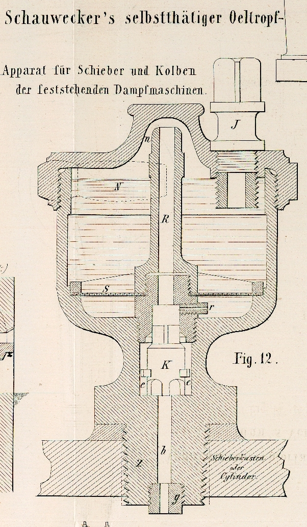 | Titel: | Schauwecker's patentirter selbstthätiger Oeltropfapparat mit selbstthätiger Wasserabhaltung für Schieber und Kolben der feststehenden Dampfmaschinen und der Locomotiven. |