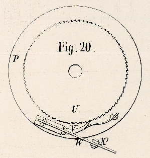 und nachgelassen. Auf diese Weise erhält auch die Sperrklinke V ihren Vorschub, während der Rückgang durch die Feder X hervorgerufen wird, welche vermittelst einer