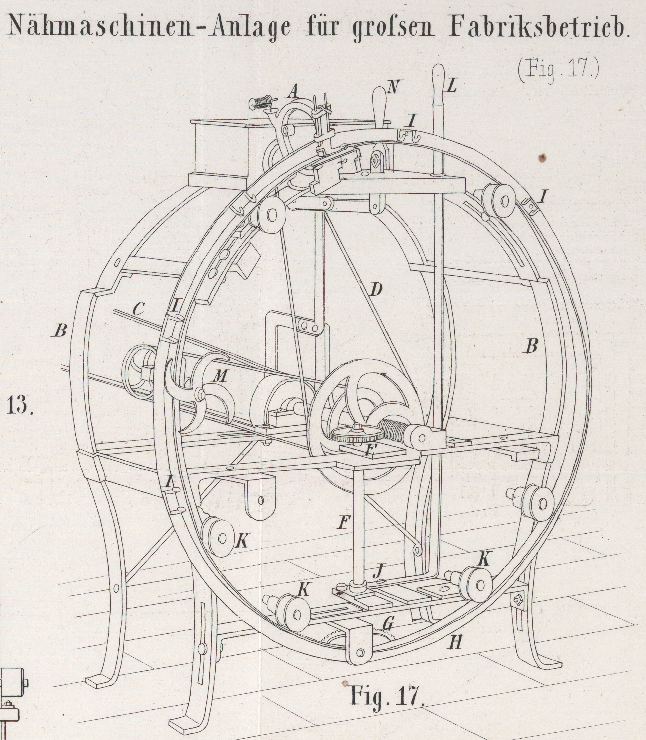 Der Riemen D pflanzt diese Bewegung auf die Nähmaschine